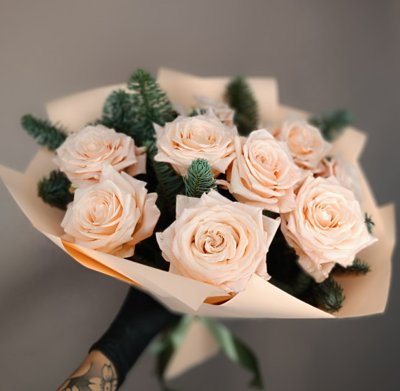 оригинальный букет с нежными розами. Очень красивый и необычный